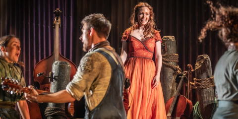 俳優たちが楽器を奏で歌い上げ、活気で満たされた舞台