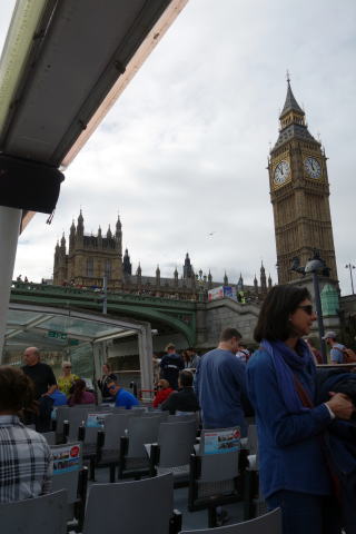 到着時は、船が出発したばかりで20分待ち(事前にウェブで時刻表も確認できます)!でも、道路より低い位置から眺めるビッグベン(エリザベスタワー)やロンドン・アイ、旧市庁舎などの景色を楽しんでいると、待ち時間もあっという間。