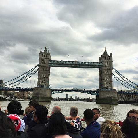 ロンドン塔ピアに到着目前には、目の前に壮大なタワー・ブリッジが現れます。ここで2度ほど船を止めて撮影時間に。この場所からの写真撮影は、SNSに掲載したい人には絶好のアングル。