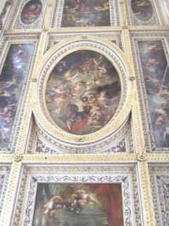 一番の見どころといえば、ピーテル・ハウル・ルーベンスの壮大な天井画。神に選ばれしジェームズ1世の王の威厳と、平和な治世を表現する天井画は4つで構成され、大きなものでは13×3メートル。ルーベンスに命じたのは、そのジェームズ1世の息子でイギリス王チャールズ1世(在位1625-1649)。1604年にイギリスとスコットランドの統一を宣言したジェームズ1世の王冠の統一が主題となっている。